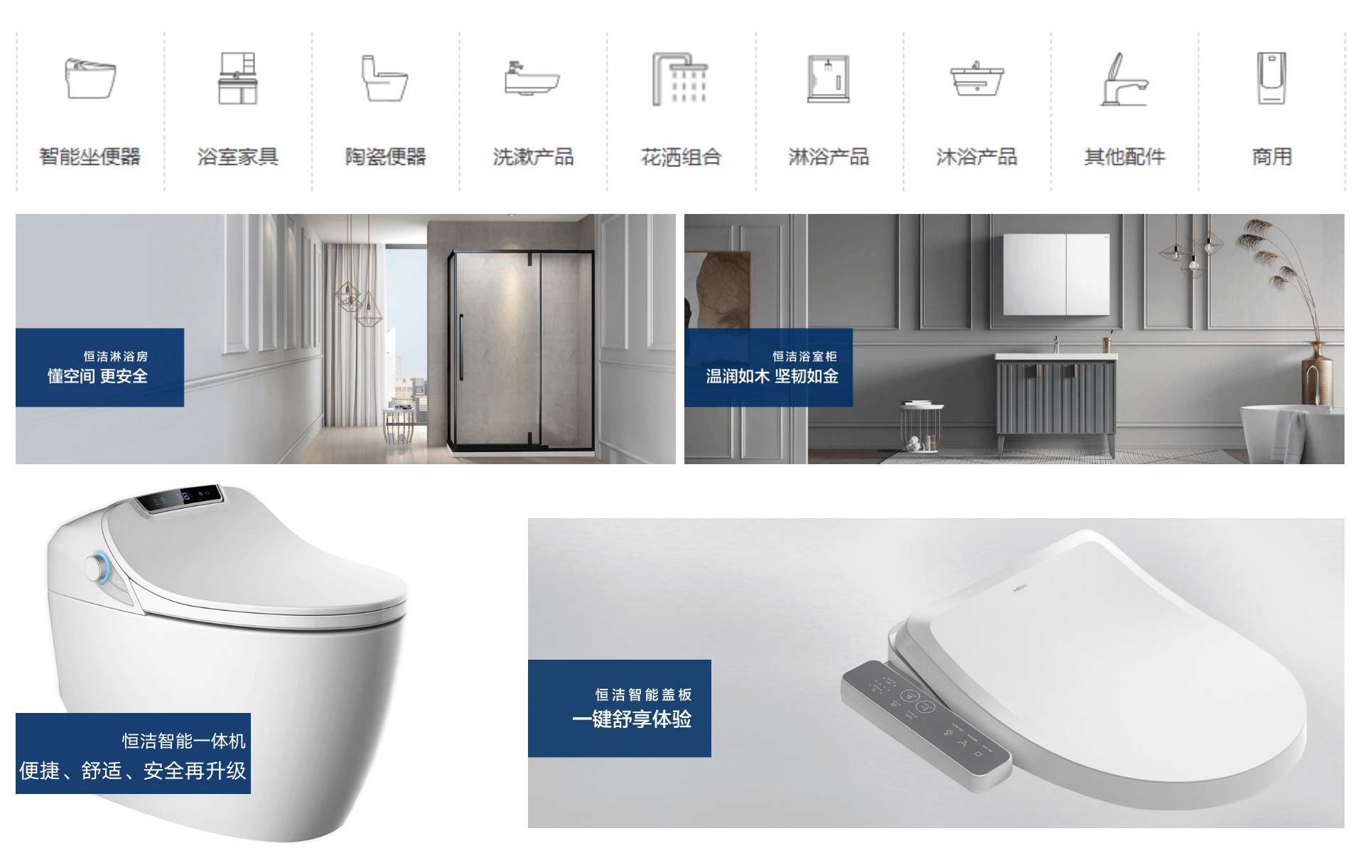 恒洁主营产品包含:智能一体机马桶、智能盖板、坐便器、浴室柜、花洒、淋浴房、浴缸、面盆八大产品系列,随着集团战略发展和市场渠道大家居的方向,恒洁在厨房、卫浴、淋浴房上的整体解决方案越有越有市场潮流引领优势。