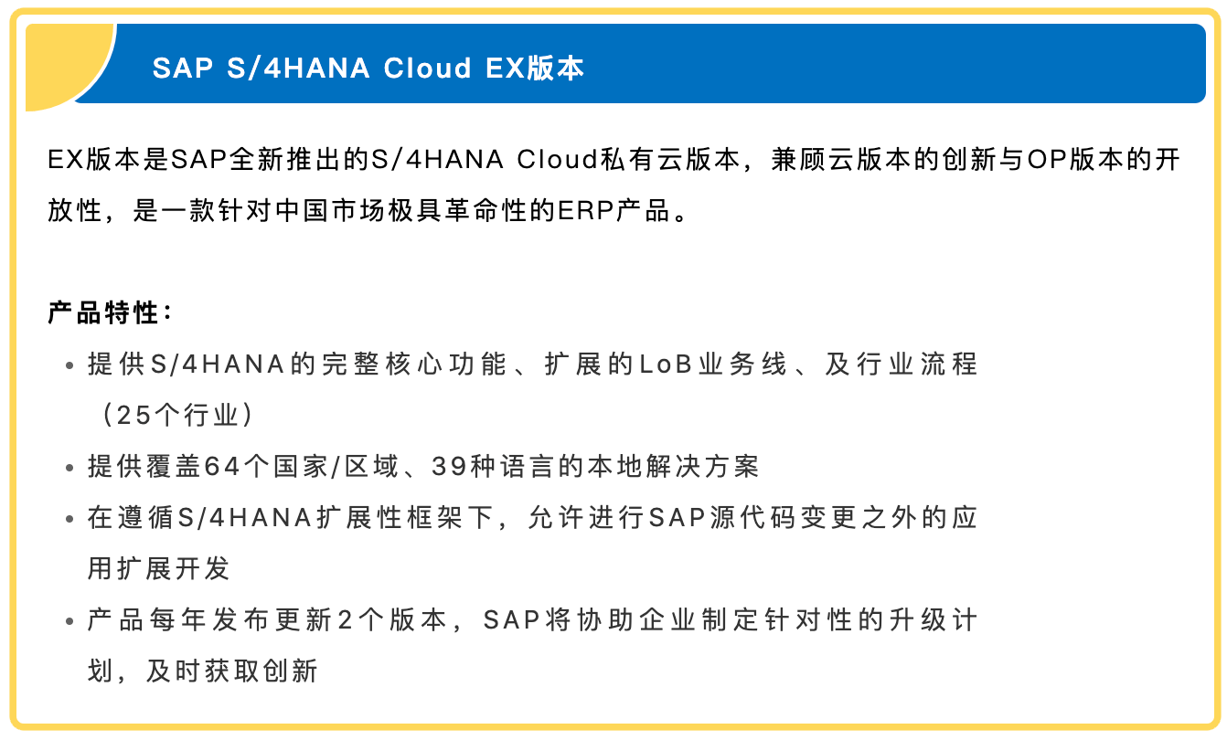 通过EX版本,客户可以通过轻松采用、扩展、集成和增强SAP全球领先的智能云产品解决方案,满足独特需求,加速完成企业数字化转型。