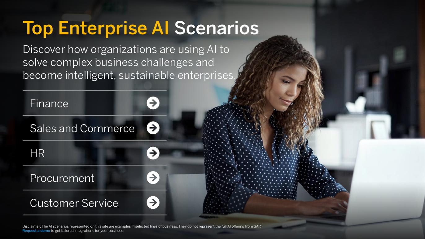 利用 SAP 应用和服务(比如 SAP SuccessFactors [HR 云] 解决方案和 SAP Business ByDesign [中小企业 ERP 云])中内置的原生 AI 服务,优化业务流程。